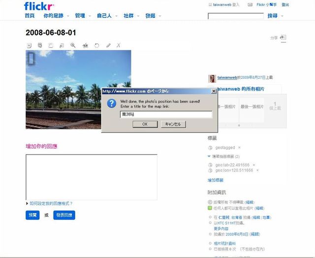 保存された「南洲站」をクリックすると、下記の地図ページに飛ぶ。ここでは、同じ地域に登録されたほかの画像も見ることができる。