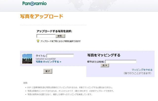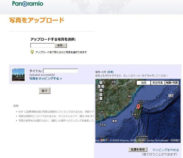 最初から位置情報付き写真をアップロードした場合は、何の手間いらずで、このように写真と地図の連携画面が完成。
