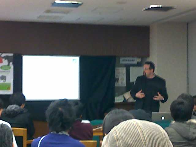 残業はしたものの、なんとか職場脱出。会場にたどりつくと、すでにイベントは始まっていた。満席で、立ち見もたくさんで、最後列になんとか滑り込んだ。通訳なしでお話は進んでいく。