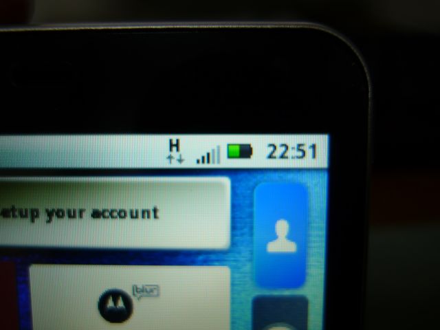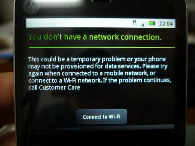 ところが、network connectionがないよとエラーメッセージが出た。この時点ではアンテナの強度マークはあれども、Hや3Gの表示が出ない。そこで、APNを見なしてもう一度アカウントの設定へ。またもやエラーメッセージが出て行き詰まった最終局面、おお! エラーメッセージの上に、燦然と輝く「H」を発見。