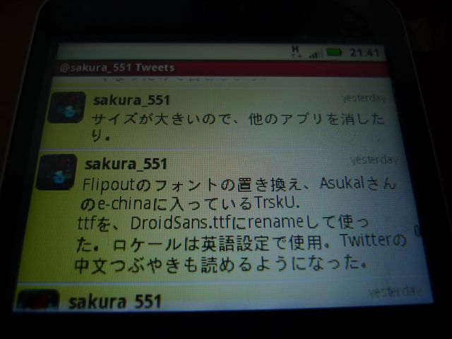 これが本物かどうか確かめるために、FLIPOUTをPCにつないで、/system/fontsにあるフォントと比較した。消さずに残されたフォントのサイズが同じだったので、本物と判断して、DroidSans.ttf、DroidSans-Bold.ttf、DroidSansJapanese.ttf、DroidSansFallback.ttfの4つを/system/fontsにコピーした。復活したフォントでみる自分のつぶやきはこの通り。あれ?こんなに読みやすいフォントだったっけ?