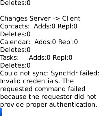# In my sync log is the error: “Could not sync: SyncHdr failed: Invalid credentials. The requested command failed because the requestor did not provide proper authentication”.