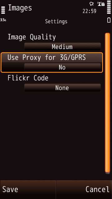 Images-Options-Settingsがこちら。おや? もしかしてProxyか? WebアクセラレーターのProxyを設定しているのを思い出した。Use Proxy for 3G/GPRSをyesにしたら、あっさりと解決した。