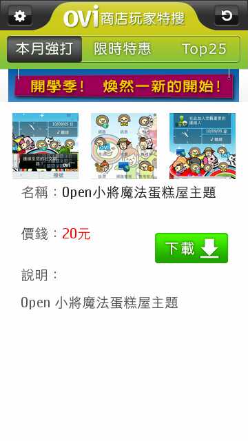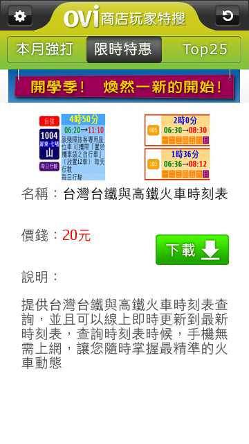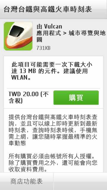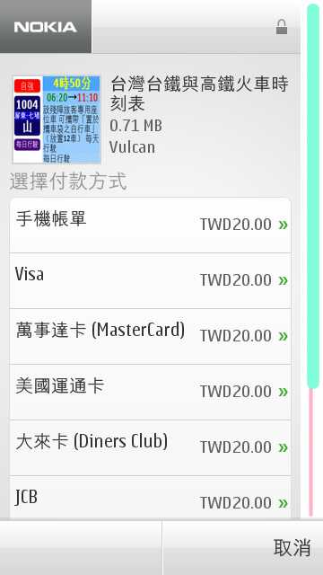 台湾版には、Ovi商店(Ovi Store)へのリンクとは別に、「玩家特捜」というリンクがあって、台湾版ならではのアプリが落とせる。そのなかには、期間限定で、無料化やディスカウントされたお得なアプリもある。今回は、購入までの手順のチェックをした。なお、台湾大哥大のSIMを入れて、Wifiでネットにアクセスした。