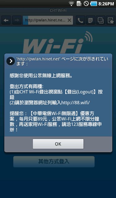 まず、wifiを立ち上げ中華電信の電波をつかむ。次にブラウザを立ち上げるとこの画面がでる。