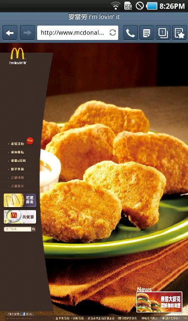 そして、マクドナルドにいるためか、ブラウザはまずマクドナルドのサイトに飛ぶ。このサイトを表示させてしまえば、後はメールでもtwitterクライアントでも、Wifiを通じて利用できる。