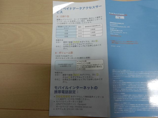 すでに山根さんがtwitterで、rgb400さんがブログで報告なさっているが、遠傳もデータ定額通信を始めた。桃園機場のカウンターで、定額プランのパンフをもらった。