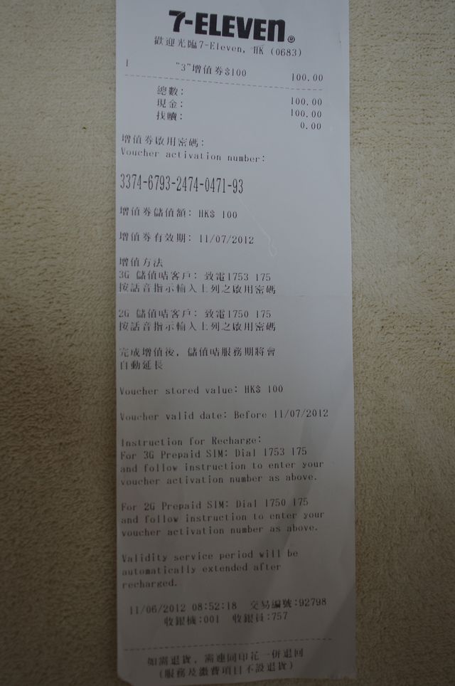 たまに香港経由するので、3HK(Hutchison香港)のSIMを持っている。香港国際空港の7-11で、3のチャージをしたいと伝え100HK$支払うと、activation numberが書かれたレシートを受け取る。このレシートにチャージ手順が書かれている。