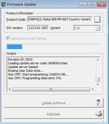 Phoenixが最新版でなかったからか、RM-807が選択肢にでなかったり、USBケーブルと電池の抜き差しで今回もまた認識せずなど、いくつかの冷や汗をかきながら、やっとRefurbishスタート。
