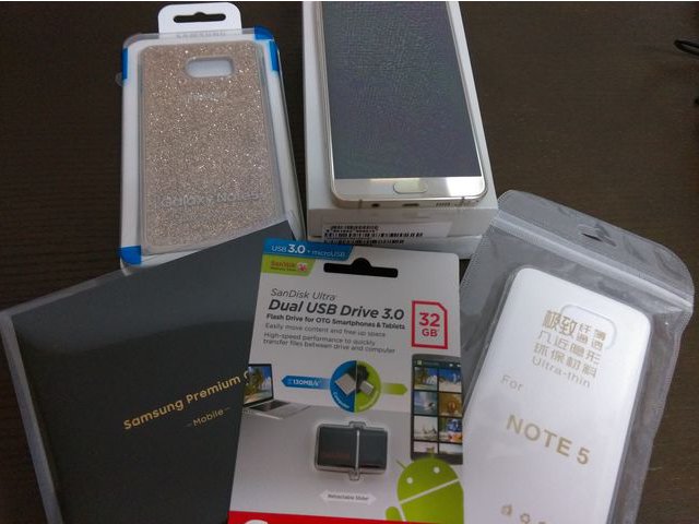 本体は26480元、同時購入のGlitter Cover(Gold)は定価990元が9折で891元。その他に諸々の特典が付いてきた。スクリーンプロテクタ、背面ソフトケース、Dual USB Drive、Samsung Premium Care一式。スクリーンプロテクタはその場で貼ってもらった。