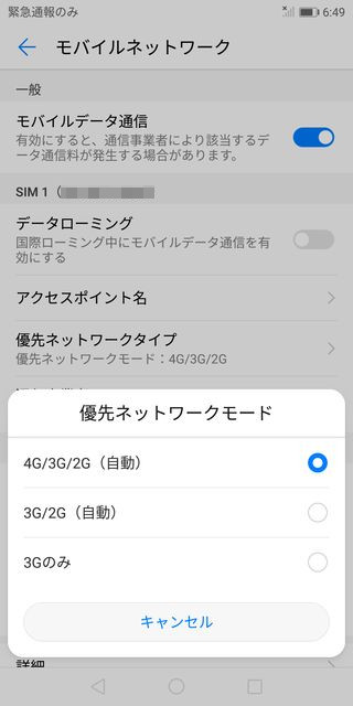 優先ネットワークタイプを3Gにしてみた。(3Gの通信には元々対応していないので、無駄だとは思ったが念のため)