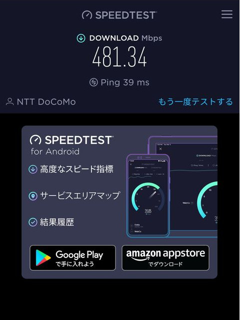北口付近で何度か速度測定したなかで、北口前の歩道(横断歩道手前)で481Mbps