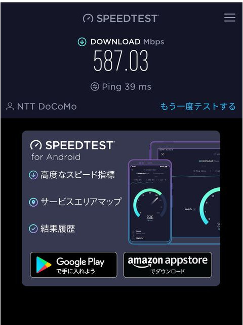 逆に西に向かって、寺田町駅前の交差点を越え、じゃんから前で測定した値が下記の587Mbps。今日の測定で最高値だった。