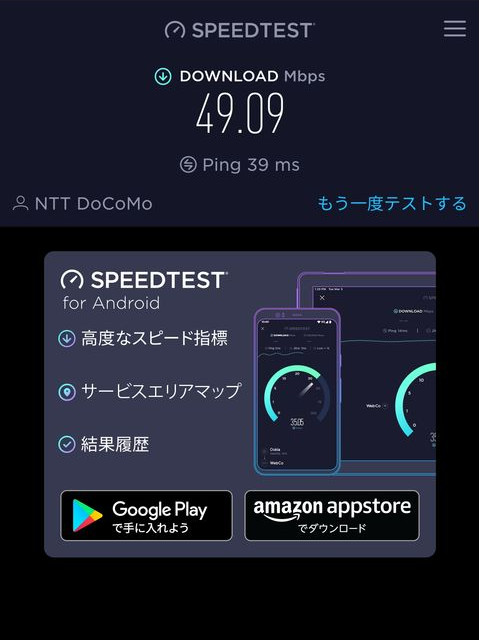 大道4の交差点まで行くと、5Gの表示のまま49Mbpsと速度はぐんと落ちた。